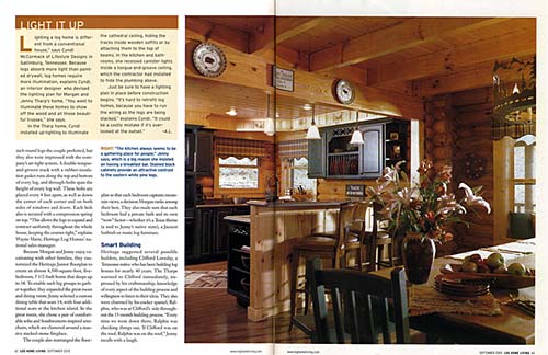 PERFECT PLANS Seduced by Morgan’s dogged determination-and an opportunity to exercise the interior design skills she honed while earning her home economics degree-Jenny agreed to join in the planning. Together, they winnowed down a trio of log home producers and chose Tennessee-based Heritage Log Homes. Not only did Heritage offer the 8-inch round logs the couple preferred, but they also were impressed with the company’s air-tight system. A double-tongue-and-groove track with a rubber-insulation gasket runs along the top and bottom of every log, and through-bolts span the height of every log wall. These bolts are placed every 4 feet apart, as well as down the center of each corner and on both sides of windows and doors. Each bolt also is secured with a compression spring on top. “ This allows the logs to expand and contract uniformly throughout the whole house, keeping the courses tight,” explains Wayne Marie, Heritage Log Homes’ national sales manager.